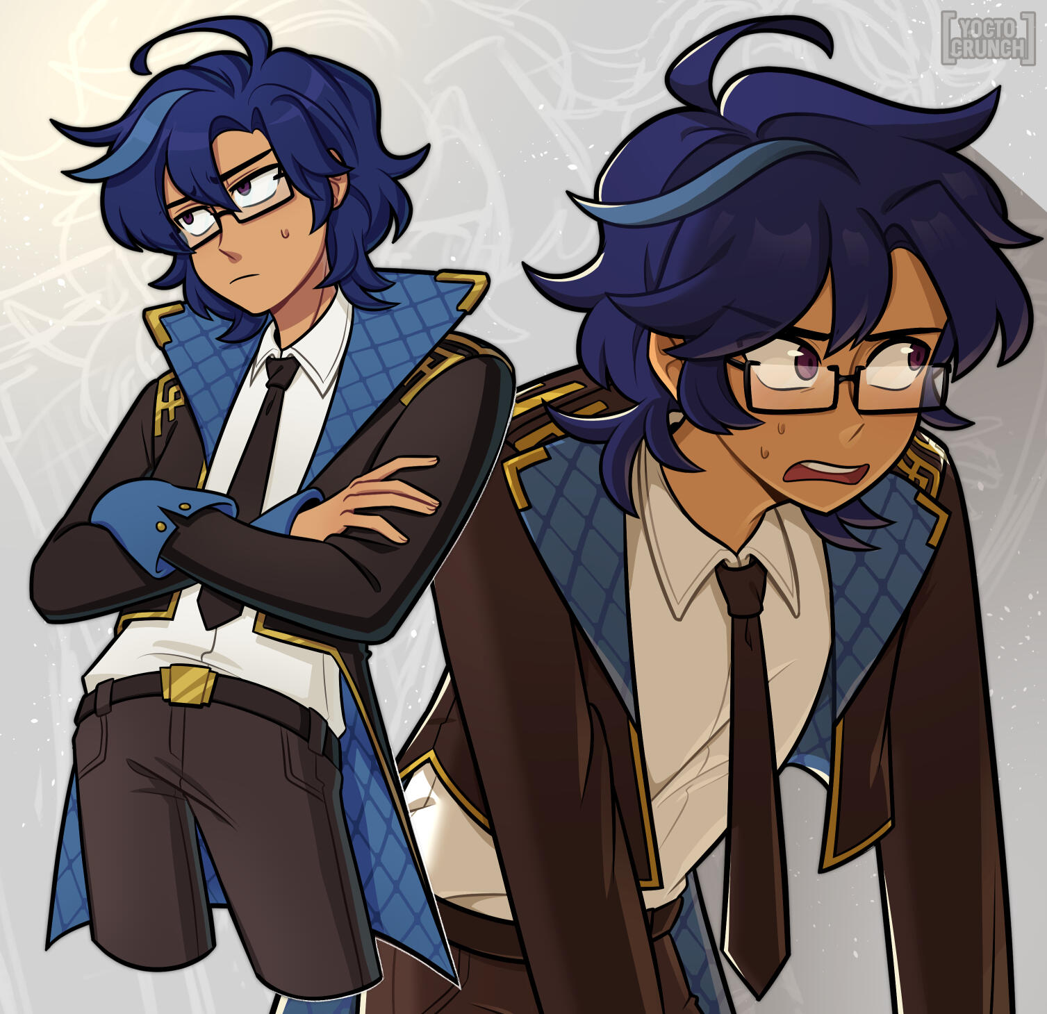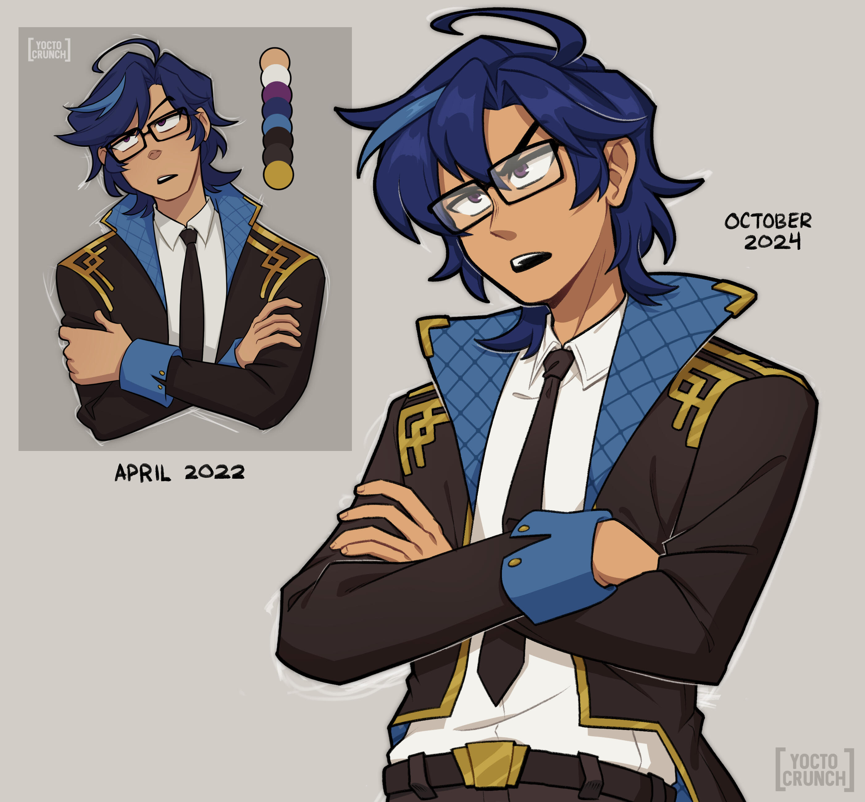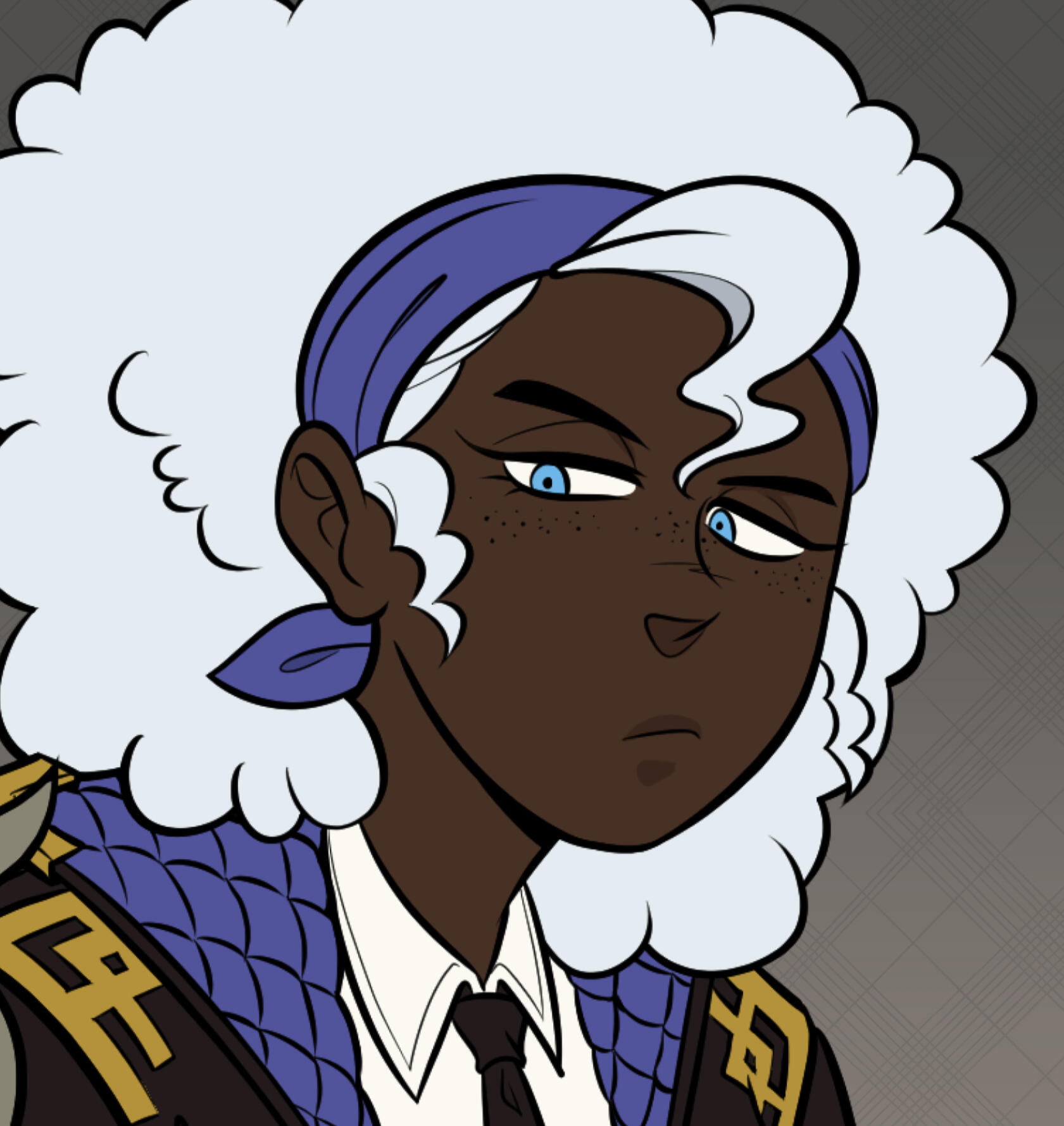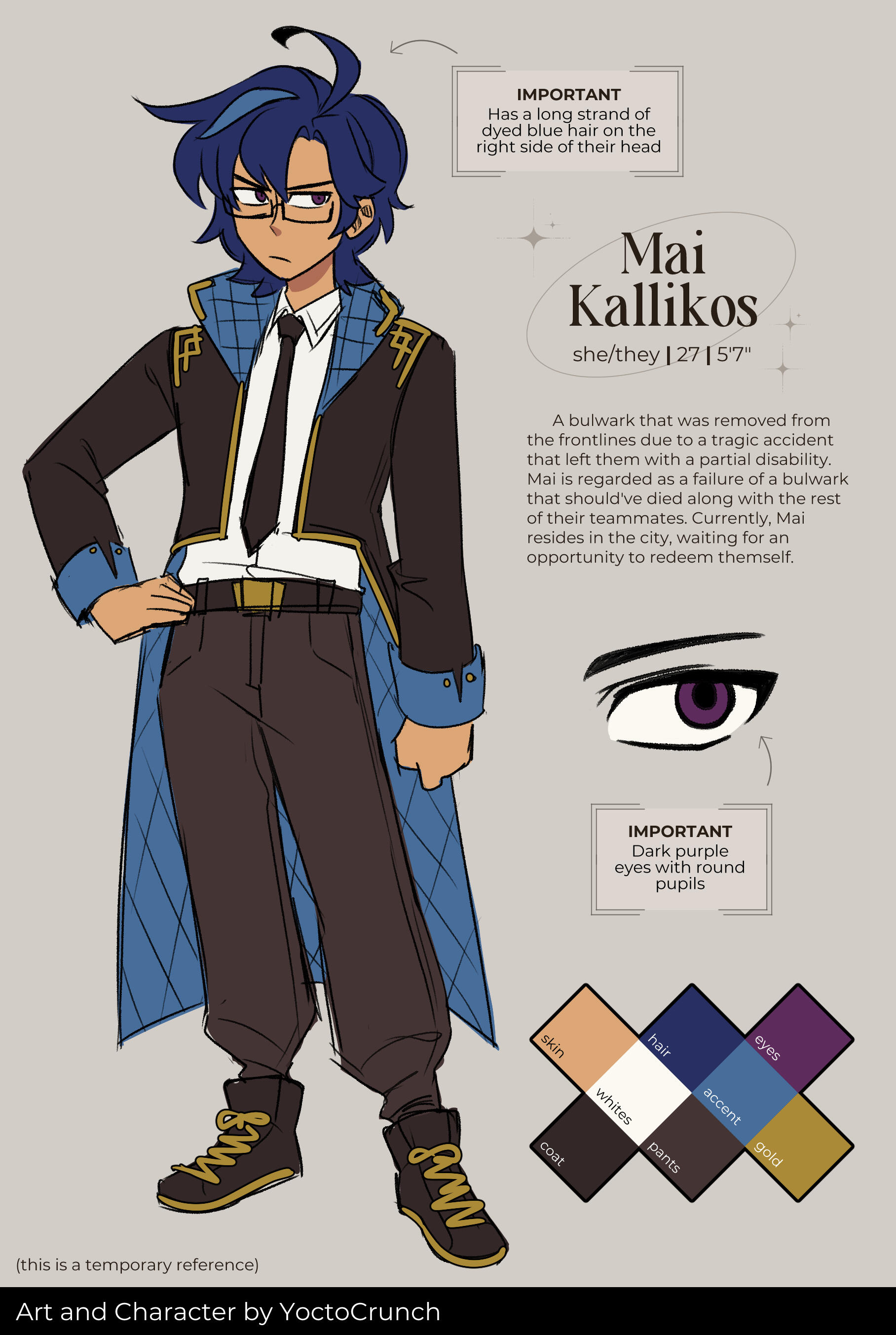 IMPORTANT Has a long strand of dyed blue hair on the right side of their head. It's a memorial of their late partners.