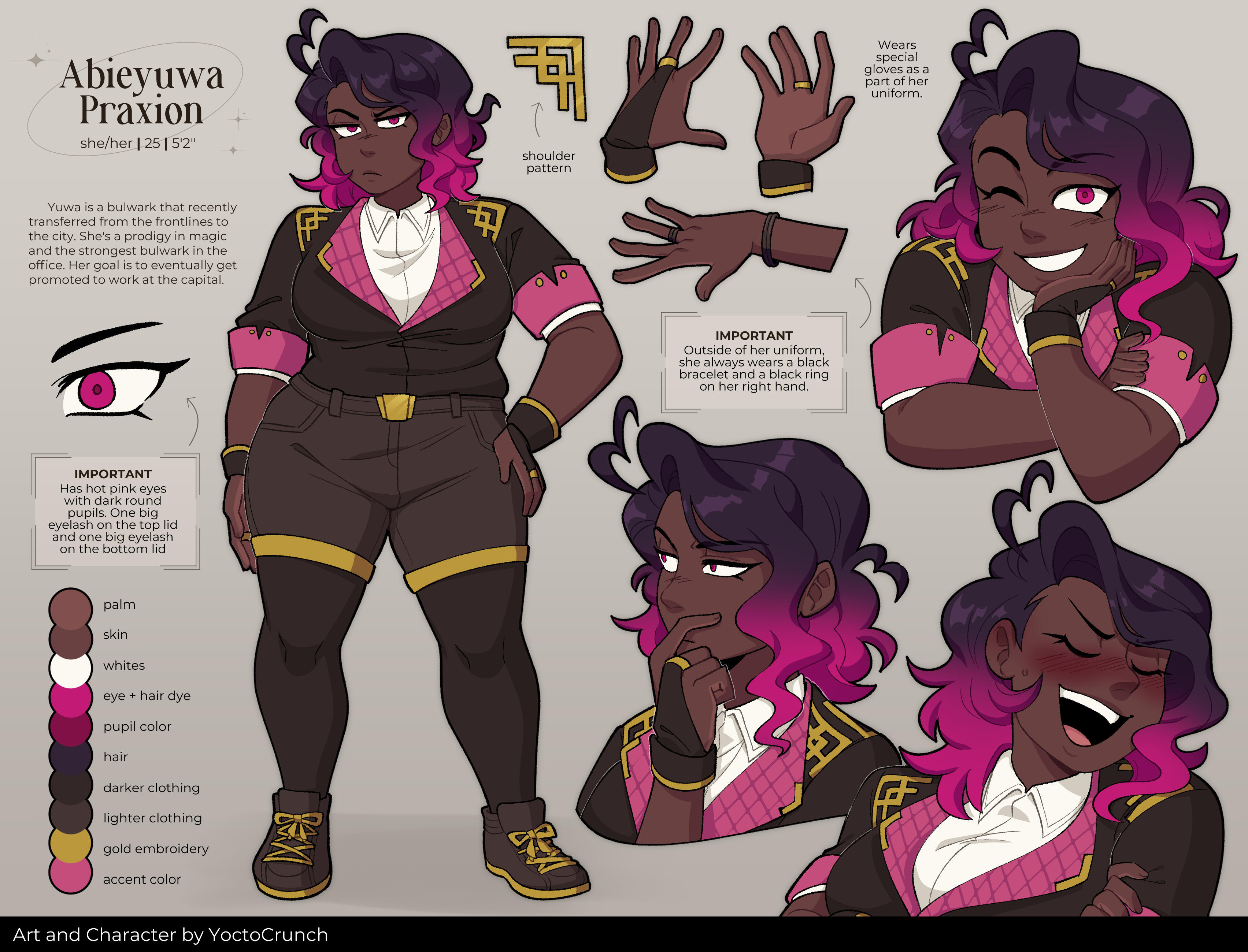 IMPORTANT Outside of her uniform, she always wears a black bracelet and a black ring on her right hand. The ring goes on her middle finger.