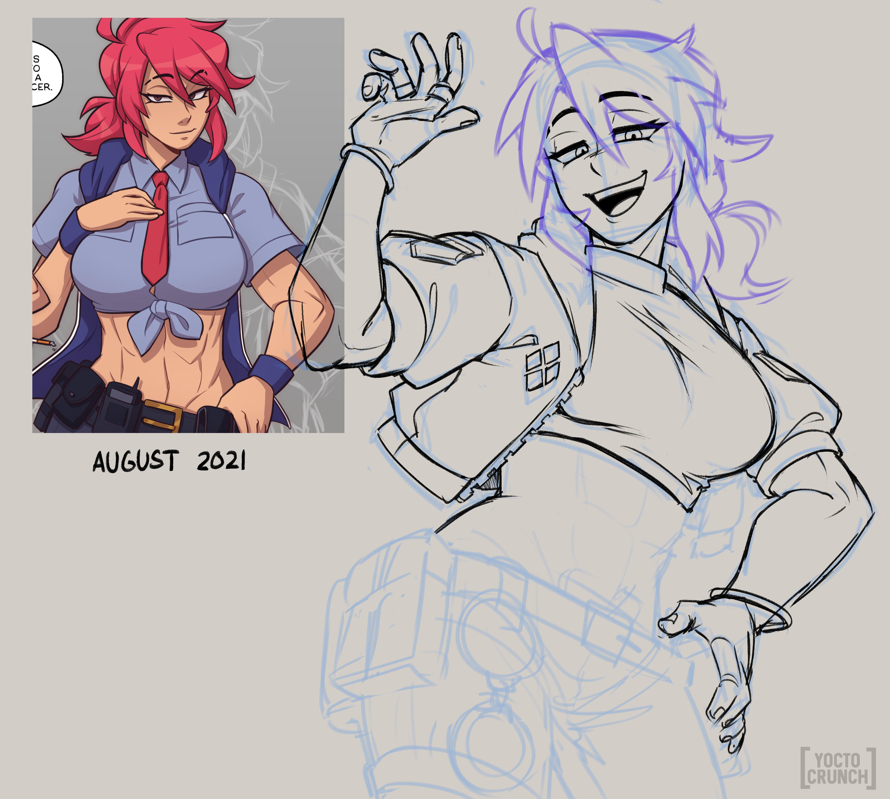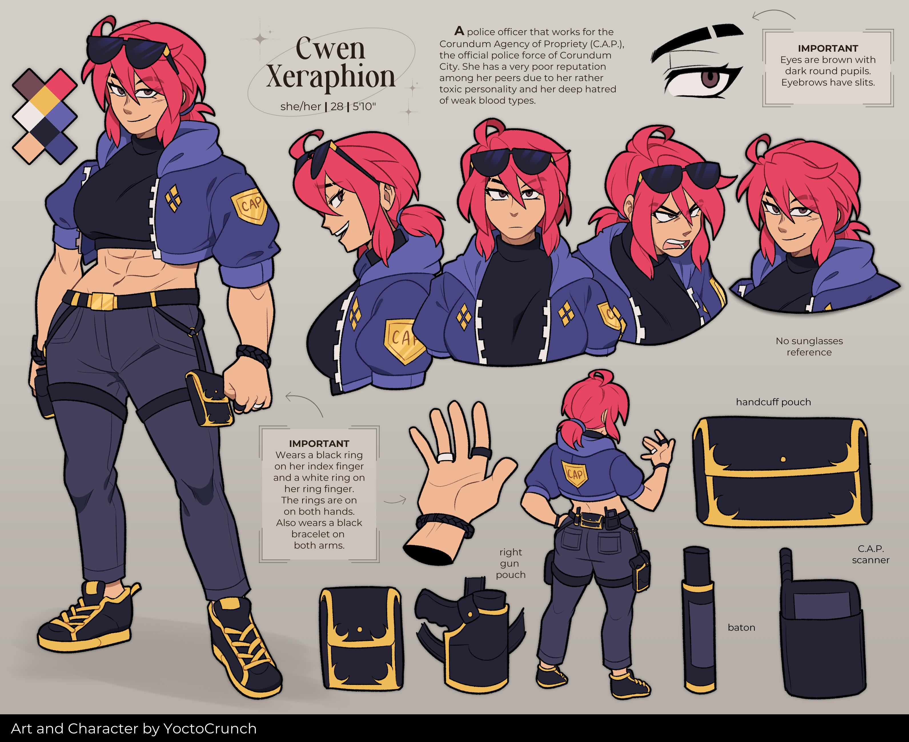 Works for the Corundum City police department. The C.A.P. abbreviation stands for Corundum Agency of Propriety.