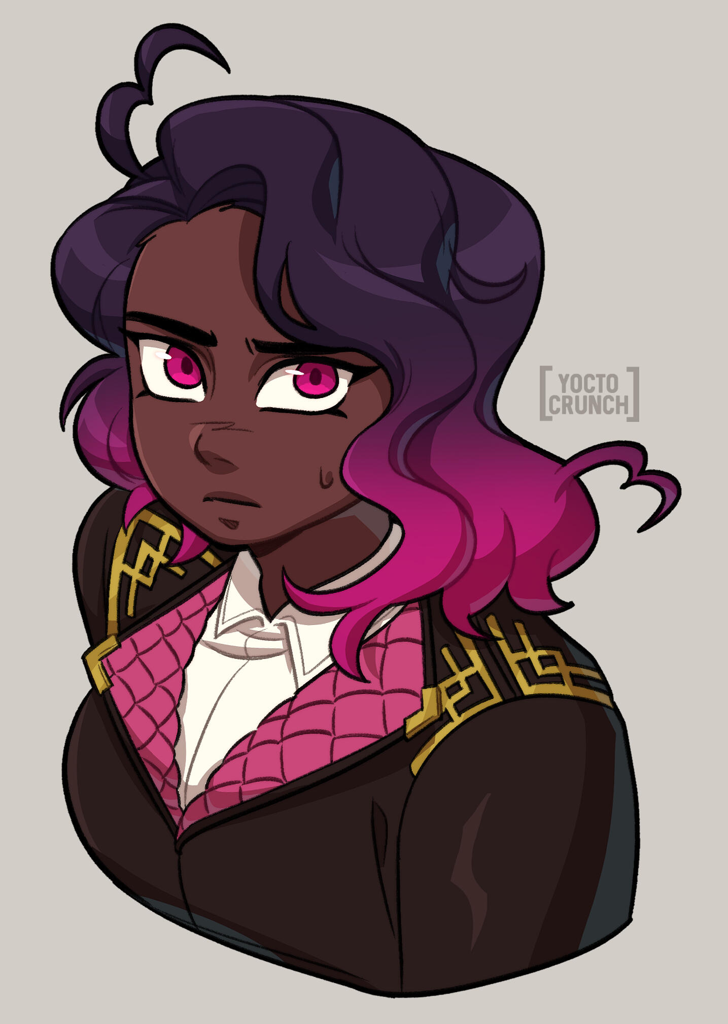 IMPORTANT Dark purple eyes with round pupils.